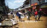 Personil TNI bersama warga membersihkan lumpur sisa banjir di Perumahan Pondok Gede Permai, Bekasi, Jawa Barat, Rabu (5/3/2025). Banjir dikawasan tersebut sudah surut dan menyisakan lumpur berwarna kecoklatan di jalan dan rumah-rumah warga. Sebagian warga mulai membersihkan sisa-sisa lumpur di rumah mereka. Menurut petugaa banjir di kawasan Pondok Gede Permai mulai surut pada Rabu (5/3/2025) dini hari, pada pukul 01.00 WIB. Sebelumnya, banjir di titik ini jadi salah satu yang terparah dengan ketinggian air mencapai 3 meter. (FOTO : Republika/Prayogi)