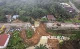 Foto udara warga menyaksikan kondisi jalan lintas Sumatera yang amblas di Desa Sirih Sekapur, Bungo, Jambi, Rabu (5/3/2025). Jalan nasional yang menghubungkan Provinsi Jambi dengan Sumatera Barat yang amblas pada Ahad (2/3) akibat hujan deras itu hingga Rabu (5/3) pagi masih belum bisa dilintasi, sementara Balai Pelaksana Jalan Nasional (BPJN) Jambi masih berupaya membangun jembatan darurat. (FOTO : ANTARA FOTO/Wahdi Septiawan)