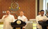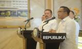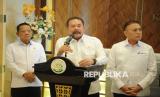 Jaksa Agung ST Burhanuddin bersama Direktur Utama Pertamina Simon Aloysius Mantiri menyampaikan keterangan pers di Gedung Kejagung, Jakarta, Kamis (6/3/2025). Dalam kesempatan tersebut Kejaksaan Agung menegaskan bahwa produk Bahan Bakar Minyak (BBM) milik Pertamina saat ini sudah bagus dan sesuai dengan standar dan spesifikasi yang telah di tentukan. Kejagung mengimbau masyarakat untuk tidak khawatir perihal penggunaan produk bahan bakar minyak (BBM) khususnya milik Pertamina. (FOTO : Republika/Prayogi)