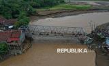Foto udara Jembatan Cidadap yang amblas akibat terjangan banjir bandang di Kampung Bojongkopo, Kecamatan Simpenan, Sukabumi, Jawa Barat, Jumat (7/3/2025). Amblasnya jembatan tersebut menyebabkan akses dari Palabuhanratu dan Kiara Dua terputus. (FOTO : ANTARA FOTO/Akbar Nugroho Gumay)