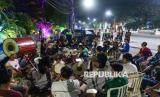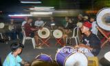 Sejumlah pemuda yang memainkan musik Kuntulan di Banyuwangi, Jawa Timur, Sabtu (8/3/2025). Kesenian Kuntulan yang dimainkan dengan alat musik bedug dan rebana itu menjadi tradisi patrol sahur masyarakat Banyuwangi pada bulan Ramadhan untuk membangunkan warga yang akan sahur. (FOTO : ANTARA FOTO/Budi Candra Setya)