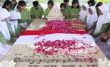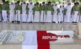 REPUBLIKA.CO.ID, SURABAYA -- Sejumlah pelajar mengheningkan cipta saat berziarah di makam pahlawan nasional WR Supratman di Surabaya, Jawa Timur, Ahad (9/3/2025).