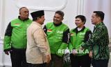 REPUBLIKA.CO.ID, JAKARTA -- Presiden Prabowo Subianto berbincang dengan CEO Gojek Patrick Walujo dan para pengemudi ojek daring seusai menyampaikan keterangan terkait pemberian tunjangan hari raya (THR) di Istana Merdeka, Jakarta, Senin (10/3/2025).