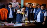 Polisi memperlihatkan proses pengisian MinyaKita tidak sesuai takaran saat rilis kasus di Desa Jambu Karya, Rajeg, Kabupaten Tangerang, Banten, Rabu (12/3/2025). Polda Banten mengungkap tempat produksi minyak goreng merek dagang MinyaKita dan Djernih yang melakukan pengurangan volume di setiap kemasan satu liter sebanyak 220-300 mililiter dengan barang bukti sebanyak 13 ton minyak curah dan seorang tersangka. (FOTO : ANTARA FOTO/Putra M. Akbar)