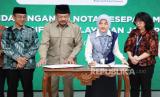 Ketua Badan Amil Zakat Nasional (BAZNAS) RI Noor Achmad (kedua kiri) bersama Presiden Direktur BCA Syariah Yuli Melati Suryaningrum (kedua kanan) menandatangani nota kesepahaman tentang Penyediaan dan Pemanfaatan Layanan Jasa Perbankan guna memberikan layanan kemudahan penyaluran Zakat, Infak, Sedekah dan Dana Sosial Keagamaan Lainnya (ZIS-DSKL) bagi masyarakat di Jakarta, Rabu (12/3/2025). BAZNAS bersama BCA Syariah meningkatkan sinergi untuk penghimpunan dan penyaluran zakat nasabah, meningkatkan aksesibilitas layanan zakat, peningkatan literasi dan inklusi, dan pengembagan digitalisasi layanan pembayaran zakat. (FOTO : Dok Republika)