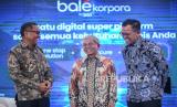 Direktur Distribution & Institutional Funding BTN Jasmin (tengah) bersama Wholesale Transaction Division Head BTN Grenardy Arief (kanan) saat acara Ngobrol Santai dengan Wartawan terkait Bale Korpora by BTN di sela kegiatan Anugerah Karya Jurnalistik BTN 2025 di Jakarta, Rabu (12/3/2025). BTN menghadirkan layanan Bale Korpora untuk bisnis wholesale banking yang akan memberikan kemudahan dan kenyamanan bagi nasabah dalam bertransaksi perbankan untuk keperluan usaha mereka. Inisiatif Bale Korpora merupakan bagian dari upaya BTN untuk memperkuat mesin pendanaan, terutama dana murah dari institusi di berbagai sektor. Hingga akhir 2024, dana murah berupa tabungan dan giro (current account saving account/CASA) menyumbang lebih dari 54 persen dana pihak ketiga BTN. (FOTO : Dok Republika)