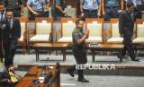 Menhan Sjafrie Sjamsoeddin memberikan salam kepada anggota DPR saat Rapat Paripurna Ke-15 Masa Persidangan II Tahun Sidang 2024-2025 di Kompleks Parlemen, Senayan, Jakarta, Kamis (20/3/2025). Melalui rapat paripurna tersebut DPR resmi mengesahkan Revisi Undang-Undang (UU) Nomor 34 Tahun 2004 tentang Tentara Nasional Indonesia (TNI) menjadi Undang-Undang. (FOTO : Republika/Prayogi)