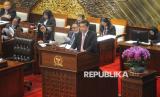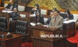 Menhan Sjafrie Sjamsoeddin membacakan pandangan akhir pemerintah saat menghadiri Rapat Paripurna Ke-15 Masa Persidangan II Tahun Sidang 2024-2025 di Kompleks Parlemen, Senayan, Jakarta, Kamis (20/3/2025). Melalui rapat paripurna tersebut DPR resmi mengesahkan Revisi Undang-Undang (UU) Nomor 34 Tahun 2004 tentang Tentara Nasional Indonesia (TNI) menjadi Undang-Undang. (FOTO : Republika/Prayogi)
