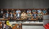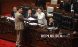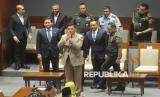 Menhan Sjafrie Sjamsoeddin (tengah) bersama Panglima TNI Jenderal TNI Agus Subiyanto dan Mensesneg Prasetyo Hadi saat menghadiri Rapat Paripurna Ke-15 Masa Persidangan II Tahun Sidang 2024-2025 di Kompleks Parlemen, Senayan, Jakarta, Kamis (20/3/2025). Melalui rapat paripurna tersebut DPR resmi mengesahkan Revisi Undang-Undang (UU) Nomor 34 Tahun 2004 tentang Tentara Nasional Indonesia (TNI) menjadi Undang-Undang. (FOTO : Republika/Prayogi)