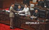 Menhan Sjafrie Sjamsoeddin memberikan pandangan akhir pemerintah kepada Ketua DPR Puan Maharani saat Rapat Paripurna Ke-15 Masa Persidangan II Tahun Sidang 2024-2025 di Kompleks Parlemen, Senayan, Jakarta, Kamis (20/3/2025). Melalui rapat paripurna tersebut DPR resmi mengesahkan Revisi Undang-Undang (UU) Nomor 34 Tahun 2004 tentang Tentara Nasional Indonesia (TNI) menjadi Undang-Undang. (FOTO : Republika/Prayogi)