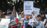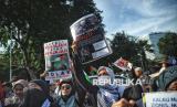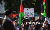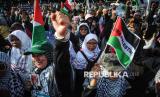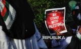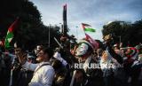 Pengunjuk rasa mengikuti aksi bela Palestina di depan Kedutaan Besar Amerika Serikat, Jakarta, Jumat (21/3/2025). Aksi bertajuk Israel Khianat Lagi tersebut mengecam serangan terbaru Israel di Gaza yang terjadi tengah gencatan senjata. Mereka juga mengajak masyarakat untuk kembali menguatkan aksi boikot produk terafiliasi Israel. Aksi ini diharapkan dapat menjadi salah satu bentuk dukungan nyata terhadap perjuangan kemerdekaan Palestina. (FOTO : Republika/Prayogi)
