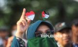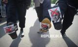 Pengunjuk rasa menunjukkan stiker yang ditempel disepatu saat mengikuti aksi bela Palestina di depan Kedutaan Besar Amerika Serikat, Jakarta, Jumat (21/3/2025). Aksi bertajuk Israel Khianat Lagi tersebut mengecam serangan terbaru Israel di Gaza yang terjadi tengah gencatan senjata. Mereka juga mengajak masyarakat untuk kembali menguatkan aksi boikot produk terafiliasi Israel. Aksi ini diharapkan dapat menjadi salah satu bentuk dukungan nyata terhadap perjuangan kemerdekaan Palestina. (FOTO : Republika/Prayogi)