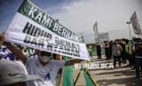 REPUBLIKA.CO.ID, JAKARTA Sejumlah warga membentangkan spanduk saat mengikuti unjuk rasa di depan kawasan Refuse Derived Fuel (RDF) Plant, Rorotan, Jakarta Utara, Jumat (21/3/2025).