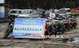 Panitia menata sepeda motor milik pemudik yang mengikuti Program Mudik Gratis DKI Jakarta 2025 di Terminal Pulo Gadung, Jakarta, Selasa (25/3/2025). Program Mudik Gratis DKI Jakarta 2025 tersebut bertujuan menekan banyaknya pemudik yang menggunakan sepeda motor sehingga masyarakat dapat melaksanakan Idul Fitri dengan selamat, aman, dan nyaman. Rencananya pemberangkatan pemudik menggunakan bus akan dilakukan pada 27 Maret 2025 dari Monas, sementara truk yang membawa sepeda motor akan diberangkatkan pada 26 Maret 2025 dari Terminal Pulogadung. Kota tujuan pemudik sepeda motor yakni, Yogyakarta, Solo, Wonogiri dan Semarang. (FOTO : Republika/Prayogi)