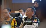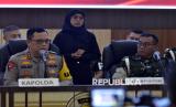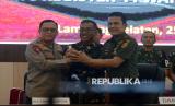 REPUBLIKA.CO.ID, LAMPUNG -- Kapolda Lampung Irjen Pol Helmy Santika melakukan salam komando bersama Wakil sementara Danpuspomad Mayjen TNI Eka Wijaya Permana, Komandan Korem 043/Gatam Brigjen TNI Rikas Hidayatullah usai rilis hasil investigasi kasus penembakan tiga anggota Polri di Polda Lampung, Lampung, Selasa (25/3/2025).