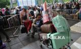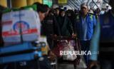 Pemudik membawa barang bawaan saat antre sebelum masuk ke dalam kapal Pelni KM Dobonsolo di Pelabuhan Tanjung Priok, Jakarta, Selasa (25/3/2025). Memasuki musim mudik lenaran 2025, Pelabuhan Tanjung Priok mulai dipadati oleh pemudik tujuan Indonesia Wilayah Timur. Berdasarkan data PT Pelni sebanyak 1.600 meninggalkan Jakarta melalui Pelabuhan Tanjung Priok menggunakan KM Dobonsolo dengan tujuan Surabaya, Makassar, Bau-Bau, Ambon, Banda, Tual, Dobo, Kaimana, dan Fak-Fak. (FOTO : Republika/Thoudy Badai)
