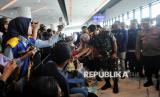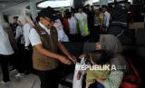 Menko Bidang Pembangunan Manusia dan Kebudayaan (PMK) Pratikno (kanan) menyapa penumpang saat meninjau kesiapan puncak arus mudik di Dermaga Eksekutif Pelabuhan Merak, Banten, Rabu (26/3/2025). Tinjauan tersebut dilakukan untuk memastikan kesiapan, kelayakan dan keamanan kepada pemudik yang melakukan perjalanan libur lebaran 2025 di Pelabuhan Merak. Sementara, pemerintah memprediksi puncak arus mudik akan terjadi pada H-3 lebaran idul fitri atau 28 Maret 2025. (FOTO : Republika/Thoudy Badai)