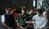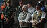 Kapolri Jenderal Pol Listyo Sigit Prabowo (kanan) bersama Panglima TNI Jenderal TNI Agus Subiyanto (kiri), Menteri Kesehatan Budi Gunadi Sadikin (kedua kiri) dan Direktur Utama PT ASDP Indonesia Ferry (Persero) Heru Widodo (kedua kanan) saat meninjau kesiapan puncak arus mudik di Dermaga Eksekutif Pelabuhan Merak, Banten, Rabu (26/3/2025). Tinjauan tersebut dilakukan untuk memastikan kesiapan, kelayakan dan keamanan kepada pemudik yang melakukan perjalanan libur lebaran 2025 di Pelabuhan Merak. Sementara, pemerintah memprediksi puncak arus mudik akan terjadi pada H-3 lebaran idul fitri atau 28 Maret 2025. (FOTO : Republika/Thoudy Badai)