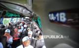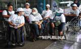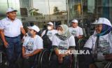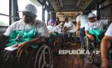 Peserta mudik penyandang disabilitas bersiap menaiki bus saat pelepasan Mudik Bersama BUMN dan BSI 2025 di Kantor Pusat BSI, Jakarta, Kamis (27/3/2025). Di tahun 2025 ini BSI memberangkatkan 1.019 pemudik dan sebanyak 379 di antaranya merupakan pemudik dengan kebutuhan khusus atau disabilitas. Untuk para pemudik disabilitas tersebut BSI menyediakan 3 bus khusus. (FOTO : Republika/Prayogi)