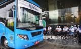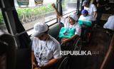 Peserta mudik berada didalam bus saat pelepasan Mudik Bersama BUMN dan BSI 2025 di Kantor Pusat BSI, Jakarta, Kamis (27/3/2025). Di tahun 2025 ini BSI memberangkatkan 1.019 pemudik dan sebanyak 379 di antaranya merupakan pemudik dengan kebutuhan khusus atau disabilitas. Untuk para pemudik disabilitas tersebut BSI menyediakan 3 bus khusus. (FOTO : Republika/Prayogi)