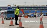 Polisi mengatur arus lalu lintas di Gerbang Tol Cikampek Utama, Karawang, Jawa Barat, Jumat (28/3/2025). Arus mudik pada H-3 Lebaran di GT Cikampek Utama ramai lancar. Pihak Kepolisian memberlakukan kebijakan satu arah dari GT Cikatama sampai GT Kalikangkung. Selama kebijakan satu arah ini semua gerbang tol menuju Jakarta ditutup. (FOTO : Republika/Edwin Dwi Putranto)