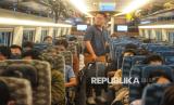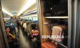 Pemudik berada di gerbong kereta cepat WHOOSH di Stasiun Kereta Cepat Halim, Jakarta, Jumat (28/3/2025). H-3 Lebaran KCIC mencatat adanya peningkatan jumlah penumpang di seluruh stasiun Whoosh. Diprediksi jumlah penumpang hari ini mencapai 18 hingga 20 ribu. Angka tersebut meningkat jika dibandingkan hari kemarin yang berkisar di 16 ribu penumpang per hari. Selain itu, KCIC memproyeksikan jumlah penumpang Whoosh selama angkutan Lebaran akan meningkat hingga 30%, mencapai hingga 24 ribu penumpang per hari. Dalam periode mudik kali ini KCIC telah menambah jumlah perjalanan Kereta sebanyak 62 jadwal dengan headway setiap 30 menit. Jumlahnya meningkat 20% dibandingkan angkutan lebaran 2024 dimana KCIC mengoperasikan sebanyak 52 perjalanan Whoosh per hari. (FOTO : Republika/Prayogi)