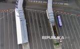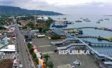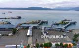 REPUBLIKA.CO.ID, BANYUWANGI -- Foto udara parkir kendaraan sepi di Pelabuhan Ketapang, Banyuwangi, Jawa Timur, Sabtu (29/3/2025).