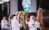Gubernur Jawa Timur Khofifah Indar Parawansa (kanan) menabuh bedug saat Gema Takbir Idul Fitri 1446 H dan Parade Bedug di Masjid Nasional Al Akbar, Surabaya, Jawa Timur, Ahad (30/3/2025). Kegiatan yang diikuti jajaran TNI, Polri, Organisasi Perangkat Daerah (OPD) Jatim dan masyarakat tersebut dalam rangka memeriahkan dan menyambut Hari Raya Idul Fitri 1446 H.  (FOTO : ANTARA FOTO/Rizal Hanafi)