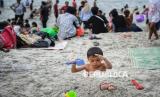 Seorang anak bermain pasir saat libur lebaran di Pantai Ancol Taman Impian, Jakarta, Selasa (1/5/2025). Momen libur Lebaran dimanfaatkan oleh warga untuk berwisata. Salah satu tujuan wisata favorit warga adalah Ancol. Tercatat pada hari kedua lebaran jumlah kunjungan wisatawan ke objek wisata itu mencapai 55 ribu orang hingga pukul 17.00 WIB. Pihak Ancol menargetkan total pengunjung selama libur Lebaran, yang berlangsung dari 31 Maret hingga 13 April 2025, mencapai 660 ribu orang. (FOTO : Republika/Prayogi)