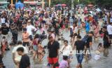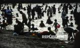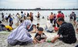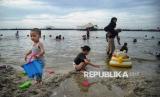 Anak-anak bermain pasir dan air saat libur lebaran di Pantai Ancol Taman Impian, Jakarta, Selasa (1/5/2025). Momen libur Lebaran dimanfaatkan oleh warga untuk berwisata. Salah satu tujuan wisata favorit warga adalah Ancol. Tercatat pada hari kedua lebaran jumlah kunjungan wisatawan ke objek wisata itu mencapai 55 ribu orang hingga pukul 17.00 WIB. Pihak Ancol menargetkan total pengunjung selama libur Lebaran, yang berlangsung dari 31 Maret hingga 13 April 2025, mencapai 660 ribu orang. (FOTO : Republika/Prayogi)