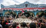 Warga berebut gunungan usai didoakan di Masjid Agung pada perayaan Tradisi Grebeg Syawal di Keraton Kasunanan, Solo, Jawa Tengah, Selasa (1/4/2025). Tradisi Grebeg Syawal tersebut digelar pada perayaan Idul Fitri 1446 Hijriah dengan memperebutkan dua gunungan Jaler (pria) dan Estri (wanita) yang dipercaya masyarakat membawa berkah dan rezeki. (FOTO : ANTARA FOTO/Mohammad Ayudha)