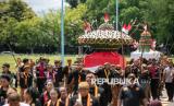 Abdi dalem Keraton membawa gunungan ke Masjid Agung pada perayaan Tradisi Grebeg Syawal di Keraton Kasunanan, Solo, Jawa Tengah, Selasa (1/4/2025). Tradisi Grebeg Syawal tersebut digelar pada perayaan Idul Fitri 1446 Hijriah dengan memperebutkan dua gunungan Jaler (pria) dan Estri (wanita) yang dipercaya masyarakat membawa berkah dan rezeki. (FOTO : ANTARA FOTO/Mohammad Ayudha)