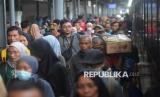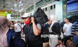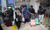 Sejumlah penumpang kereta api berjalan keluar setibanya di Stasiun Pasar Senen, Jakarta, Jumat (4/4/2025). PT Kereta Api Indonesia (KAI) Daerah Operasi (Daop) 1 Jakarta melaporkan kondisi terkini terkait volume penumpang selama periode arus balik Lebaran 1446 H/2025, yang diperkirakan mencapai puncaknya pada hari ini. Sejak dimulai pada 31 Maret 2025, arus balik kali ini menunjukkan angka yang cukup tinggi, dengan kedatangan penumpang yang terus meningkat setiap harinya. Pada hari ini 4 April 2025, volume penumpang yang datang ke Daop 1 Jakarta terus menunjukkan angka yang signifikan, dengan jumlah penumpang yang datang mencapai 52.056 orang. Dengan rincian kedatangan penumpang di stasiun-stasiun besar di Jakarta yaitu Stasiun Gambir 16.700 penumpang dan Stasiun Pasar Senen 18.250 penumpang serta sisanya distasiun lainnya. (FOTO : Republika/Prayogi)