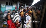 REPUBLIKA.CO.ID, JAKARTA -- Sejumlah penumpang kereta api berjalan keluar setibanya di Stasiun Pasar Senen, Jakarta, Jumat (4/4/2025).