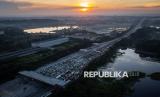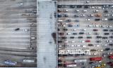 Foto udara sejumlah kendaraan pemudik melaju perlahan di Gerbang Tol Cikampek Utama, Karawang, Jawa Barat, Ahad (6/4/2025). Berdasarkan data PT Jasamarga Transjawa Tol (JTT) dari H1 hingga puncak arus balik Lebaran H+5 pada pukul 06.15 WIB tercatat sebanyak 388.001 unit kendaraan melintas di Gerbang Tol Cikampek Utama. (FOTO : ANTARA FOTO/Bayu Pratama S)