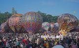 Sejumlah warga menyaksikan penerbangan balon udara saat Festival Balon Udara 2025 di alun-alun Kota Wonosobo, Jawa Tengah, Ahad ( 6/4/2025). Festival Balon Udara 2025 yang digelar selama enam hari di 16 lokasi tersebut didukung oleh AirNav Indonesia, Kementerian Perhubungan, Pemerintah Daerah, serta komunitas pecinta balon udara guna melestarikan budaya tradisional sekaligus sebagai daya tarik wisata. (FOTO : ANTARA FOTO/Anis Efizudin)
