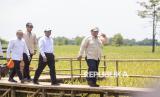 Presiden Prabowo Subianto (kanan) bersama Menteri Pertanian Andi Amran Sulaiman (kedua kanan), dan Menteri Koordinator Bidang Pangan Zulkifli Hasan (kiri) melihat lokasi panen raya padi di Desa Randegan Wetan, Ligung, Majalengka, Jawa Barat, Senin (7/4/2025). Presiden Prabowo memimpin panen raya padi secara serentak bersama petani di 14 provinsi dan 157 kabupaten/kota sebagai upaya memperkuat ketahanan pangan nasional. (FOTO : ANTARA FOTO/Dedhez Anggara)