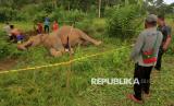 REPUBLIKA.CO.ID, ACEH -- Warga melihat bangkai gajah Sumatera (Elephas maximus sumatrensis) yang mati di area persawahan Desa Alue Jang, Kecamatan Pasie Raya, Aceh Jaya, Aceh, Rabu (9/4/2025).