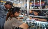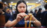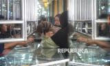 Karyawan melayani warga yang melakukan transaksi jual beli emas perhiasan di salah satu toko emas di Pasar Kebayoran Lama, Jakarta, Ahad (13/4/2025). Menurut karyawan toko ditengah tingginya harga emas saat ini jumlah warga yang menjual dan membeli perhiasan emas masih seimbang. Namun kini warga cenderung membeli/mencari emas perhiasan dengan berat kecil, umumnya tidak lebih dari 2,5 gram. Harga perhiasan emas muda kini berkisar antara Rp850 ribu hingga Rp870 ribu per gram, naik dari harga sebelum Lebaran yang berada di kisaran Rp750 ribu hingga Rp800 ribu per gram. Salah satu pembeli Indah, mengaku membeli emas perhiasan untuk disimpan selain itu menurutnya emas perhiasan juga lebih mudah untuk dijual kembali. (FOTO : Republika/Prayogi)