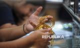 REPUBLIKA.CO.ID, JAKARTA -- Karyawan melayani warga yang melakukan transaksi jual beli emas perhiasan di salah satu toko emas di Pasar Kebayoran Lama, Jakarta, Ahad (13/4/2025).