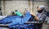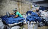Pekerja memotong dan merapikan pakaian bekas untuk didaur ulang di Kantor EcoTouch, Jakarta, Selasa (15/4/2025). Pakaian yang berasal dari sumbangan masyarakat dan perusahaan ini diolah menjadi produk ramah lingkungan bernilai tinggi, seperti peredam bangunan, benang, kain tenun, dan merchandise. Program daur ulang ini menjadi upaya EcoTouch dalam mengurangi limbah tekstil,sekaligus menciptakan nilai ekonomi dari limbah. (FOTO : Republika/Prayogi)