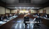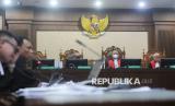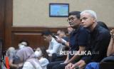 Majelis hakim menyimak keterangan saksi pada sidang lanjutan dengan terdakwa kasus dugaan perintangan penyidikan kasus korupsi Harun Masiku dan pemberian suap Hasto Kristiyanto di Pengadilan Tipikor, Jakarta, Kamis (17/4/2025). Sidang tersebut beragendakan mendengar keterangan saksi antara lain yakni mantan Ketua Komisi Pemilihan Umum (KPU) Arief Budiman dan mantan anggota KPU Wahyu Setiawan. Sementara salah satu saksi yaitu mantan Anggota Bawaslu yaitu Agustiani Tio Fridelina tidak hadir dalam persidangan. (FOTO : Republika/Prayogi)