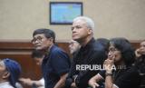 Politisi PDIP Ganjar Pranowo dan Djarot Saiful Hidayat menghadiri sidang lanjutan dengan terdakwa kasus dugaan perintangan penyidikan kasus korupsi Harun Masiku dan pemberian suap Hasto Kristiyanto di Pengadilan Tipikor, Jakarta, Kamis (17/4/2025). Sidang tersebut beragendakan mendengar keterangan saksi antara lain yakni mantan Ketua Komisi Pemilihan Umum (KPU) Arief Budiman dan mantan anggota KPU Wahyu Setiawan. Sementara salah satu saksi yaitu mantan Anggota Bawaslu yaitu Agustiani Tio Fridelina tidak hadir dalam persidangan. (FOTO : Republika/Prayogi)