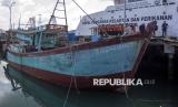 Sebuah kapal pencuri ikan diamankan di Pangkalan PSDKP Batam, Kepulauan Riau, Jumat (18/4/2025). Kementerian Kelautan dan Perikanan (KKP) menyebutkan sebanyak 240 kapal pencuri ikan yang diamankan terdiri dari 30 kapal berbendera asing dan 210 kapal ikan lokal yang terlibat dalam praktik illegal fishing di Wilayah Pengelolaan Perikanan Negara Republik Indonesia (WPPNRI) sepanjang tahun 2024. (FOTO : ANTARA FOTO/Teguh Prihatna)