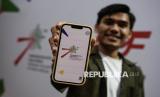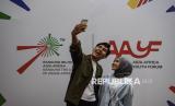 REPUBLIKA.CO.ID, BANDUNG -- Warga menunjukkan logo peringatan Ke-70 Tahun Konferensi Asia Afrika usai diresmikan di Bandung, Jawa Barat, Jumat (18/4/2025).