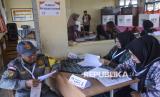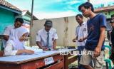 Petugas Kelompok Penyelenggara Pemungutan Suara mendata warga yang akan menggunakan hak pilih saat pemilihansuara ulang Pilkada Kabupaten Serang di TPS 05 Nambo Ilir, Kabupaten Serang, Banten, Sabtu (19/4/2025). Petugas KPPS menggunakan seragam sekolah guna menarik perhatian serta meningkatkan partisipasi warga dalam menggunakan hak pilih dalam pemungutan suara ulang Pilkada Kabupaten Serang 2024. (FOTO : ANTARA FOTO/Muhammad Bagus Khoirunas)