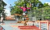 Seorang anak bermain skateboard dengan mengenakan busana kebaya di Denpasar, Bali, Ahad (20/4/2025). Kegiatan itu diselenggarakan untuk memeriahkan peringatan Hari Kartini sekaligus mengajak para perempuan khususnya generasi muda untuk terus berkarya dan melakukan kegiatan-kegiatan yang positif. (FOTO : ANTARA FOTO/Fikri Yusuf)
