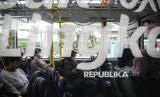 Penumpang berada didalam bus Transjakarta di Halte Bundaran HI, Jakarta, Senin (21/4/2025). Pemprov DKI Jakarta menggratiskan jasa angkutan umun TransJakarta, MRT dan LRT untuk perempuan pada hari ini dalam rangka memperingati Hari Kartini. Ada jalur khusus yang disediakan bagi perempuan untuk memanfaatkan skema tarif khusus hari ini. (FOTO : Republika/Prayogi)