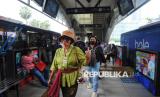 Penumpang berjalan keluar usai menaiki bus Transjakarta di Halte Bundaran HI, Jakarta, Senin (21/4/2025). Pemprov DKI Jakarta menggratiskan jasa angkutan umun TransJakarta, MRT dan LRT untuk perempuan pada hari ini dalam rangka memperingati Hari Kartini. Ada jalur khusus yang disediakan bagi perempuan untuk memanfaatkan skema tarif khusus hari ini. (FOTO : Republika/Prayogi)