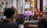 Jemaat mengikuti misa harian di Gereja Katedral, Jakarta,Senin (21/4/2025). Misdinar memimpin ibadah misa harian di Gereja Katedral, Jakarta,Senin (21/4/2025). Misa harian tersebut juga dilaksanakan doa untuk Paus Fransiskus yang wafat pada usia 88 tahun pukul 07:35 waktu Vatikan. (FOTO : ANTARA FOTO/Fathul Habib Sholeh)